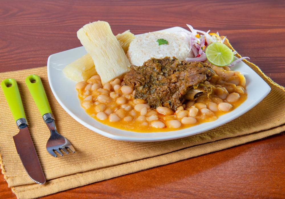 - Seco de cabrito: Guiso de cabrito macerado en chicha de jora y especias, acompañado de frejoles o arroz blanco.