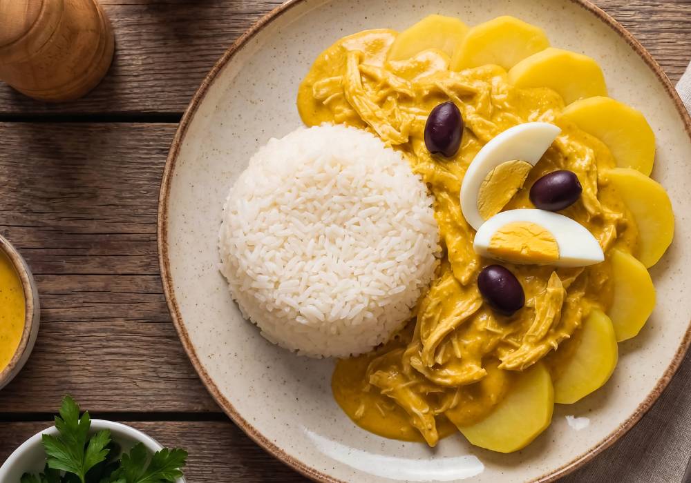 Plato típico de Lima elaborado con pollo deshilachado y una crema suave de ají amarillo, pan y leche.